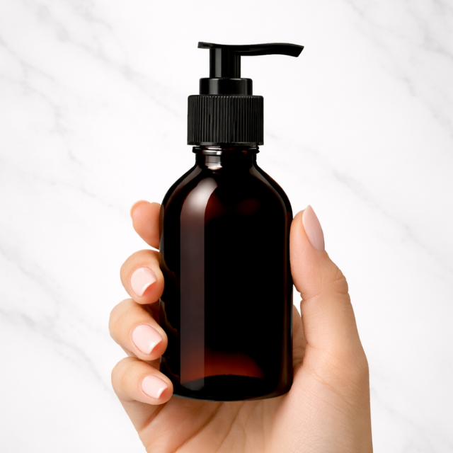 Frasco em PET rígido na cor âmbar, ideal para fórmulas com óleos essenciais, como sabonetes líquidos, cremes, óleos carreadores, loções e outras preparações cosméticas. Acompanha válvula pump com sistema de trava (abre/fecha), garantindo praticidade, segurança e controle de dosagem.