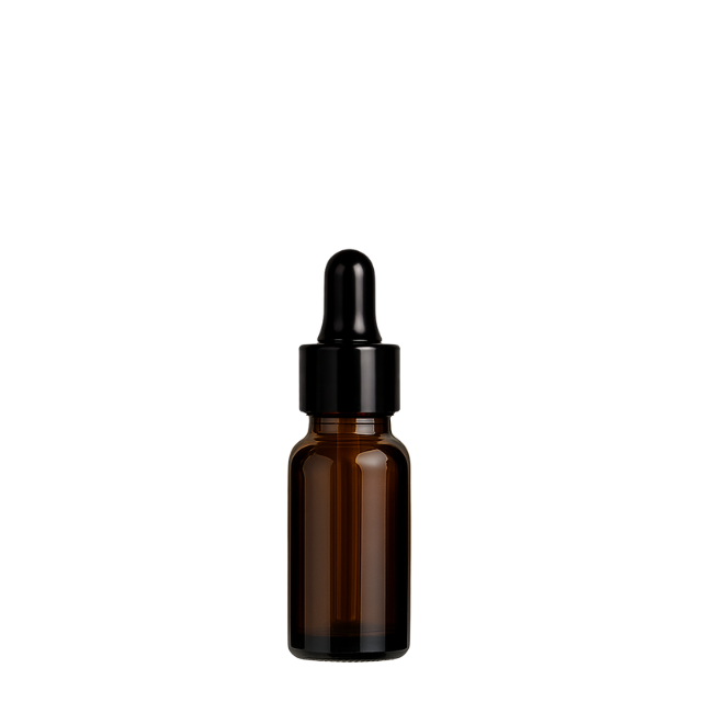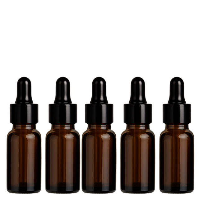 Frasco compacto em vidro âmbar com tampa plástica preta, ideal para armazenar e aplicar sinergias, óleos essenciais puros ou carreadores. Acompanha pipeta de vidro com bulbo de silicone e tampa sem lacre, garantindo vedação segura e aplicação precisa.