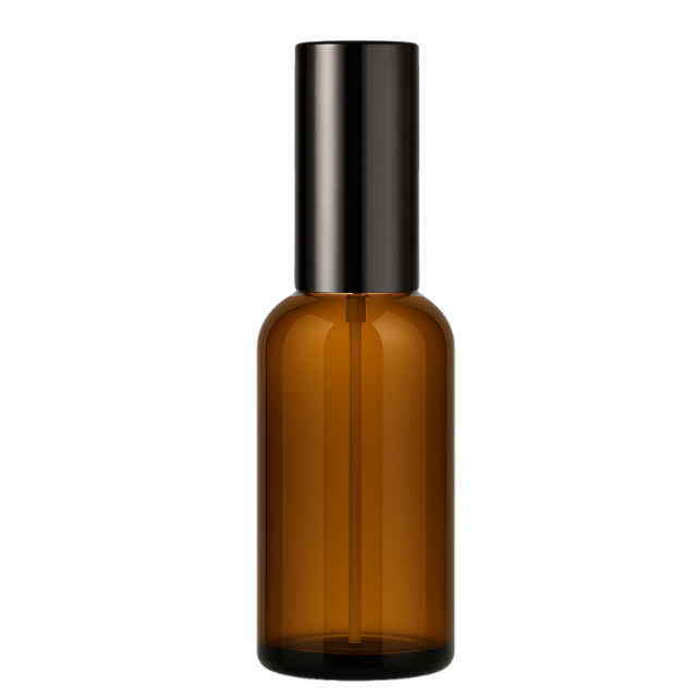 Frasco em vidro âmbar com válvula spray metalizada, ideal para perfumes.
