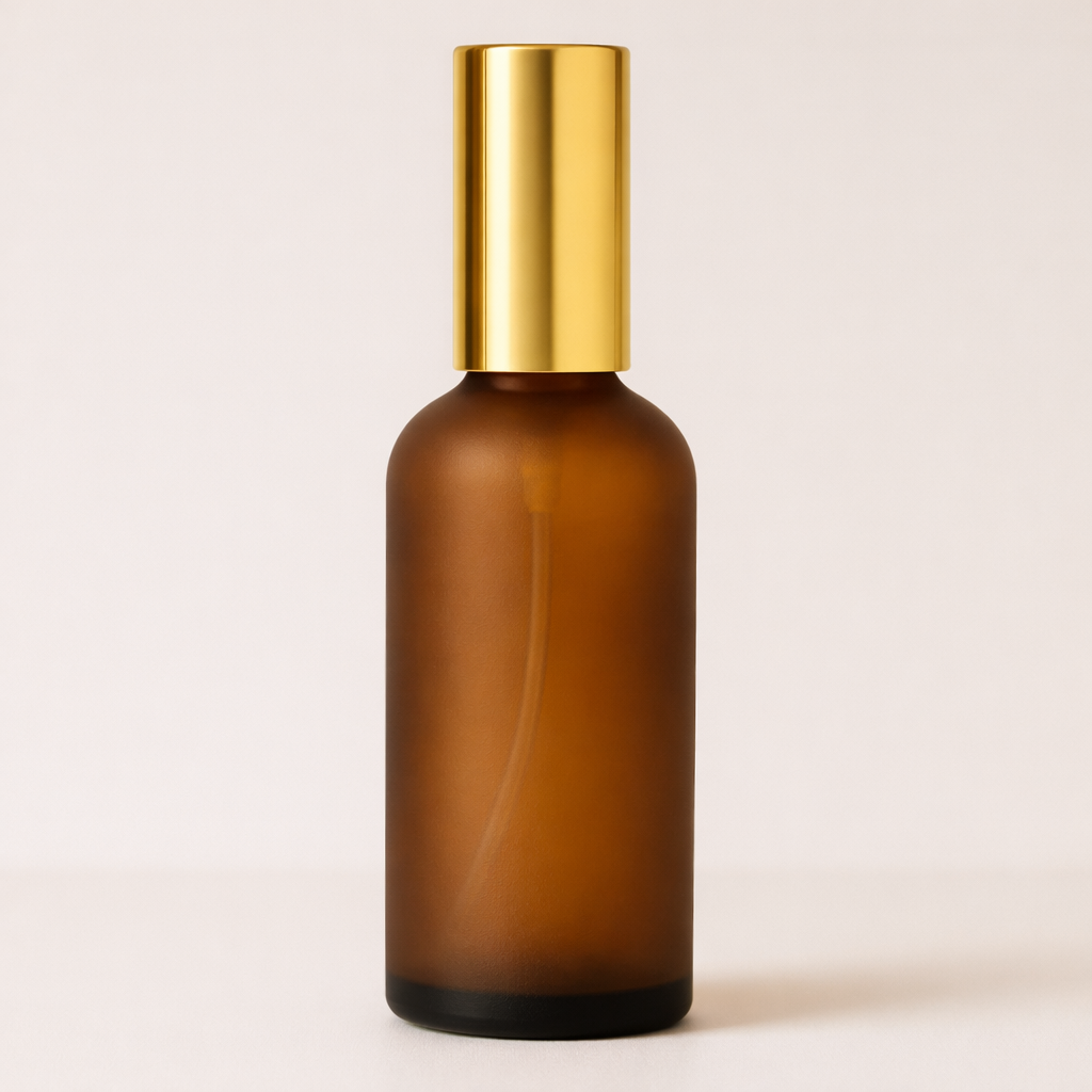 Frasco em vidro fosco âmbar com válvula spray metalizada, ideal para perfumes.